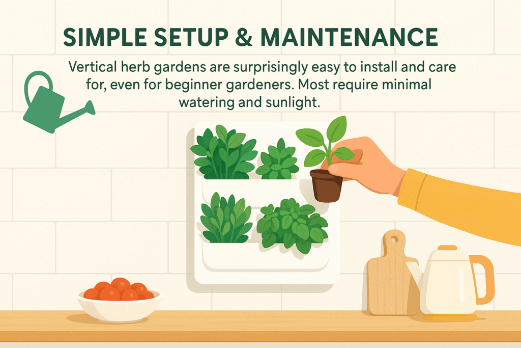 Worried you don’t have a green thumb? This final section reassures you that vertical kitchen herb gardens are surprisingly easy to set up and maintain. Our infographic conveys the simplicity of these systems, making them accessible even for gardening novices. Most vertical gardens require minimal watering and can thrive with adequate sunlight or a simple grow light. It’s an effortless way to introduce more freshness into your home without a lot of fuss.